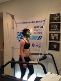 La prueba consiste en lo siguiente: me colocaron una serie de electrodos en el cuerpo para ver el funcionamiento del corazón y controlar las pulsaciones y una máscara ajustada en la cara (un poco agobiante) que va registrando el aire inspirado y el expirado. La prueba se inicia a un ritmo lento sobre una cinta de correr o bicicleta, y se va incrementando el ritmo (kilómetros/hora con mismo desnivel en mi caso) hasta que no pude aguantar más el ritmo.